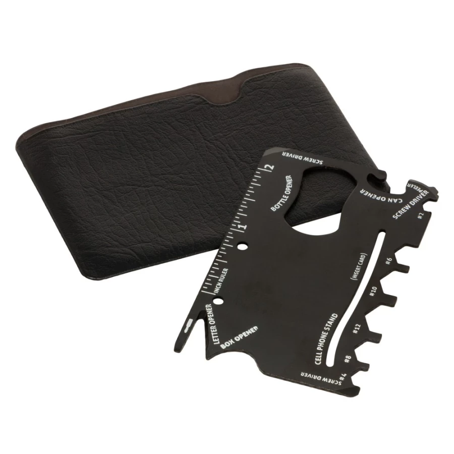 Narzędzie wielofunkcyjne w etui, 9 funkcji: linijka, mini wkrętak, otwieracz do kartonu, 2x wkrętak, klucze płaskie (#2, #4, #6, #8, #10, #12), podstawka pod telefon (karta nie jest dołączona), otwieracz do puszek, otwieracz do butelek