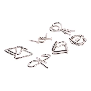Zestaw składający się z 6 par metalowych łamigłówek w drewnianym pudełku. Drewno jest produktem naturalnym, mogą wystąpić niewielkie różnice w kolorze co może mieć wpływ na końcowy efekt znakowania. (każda sztuka może mieć inny efekt końcowy)